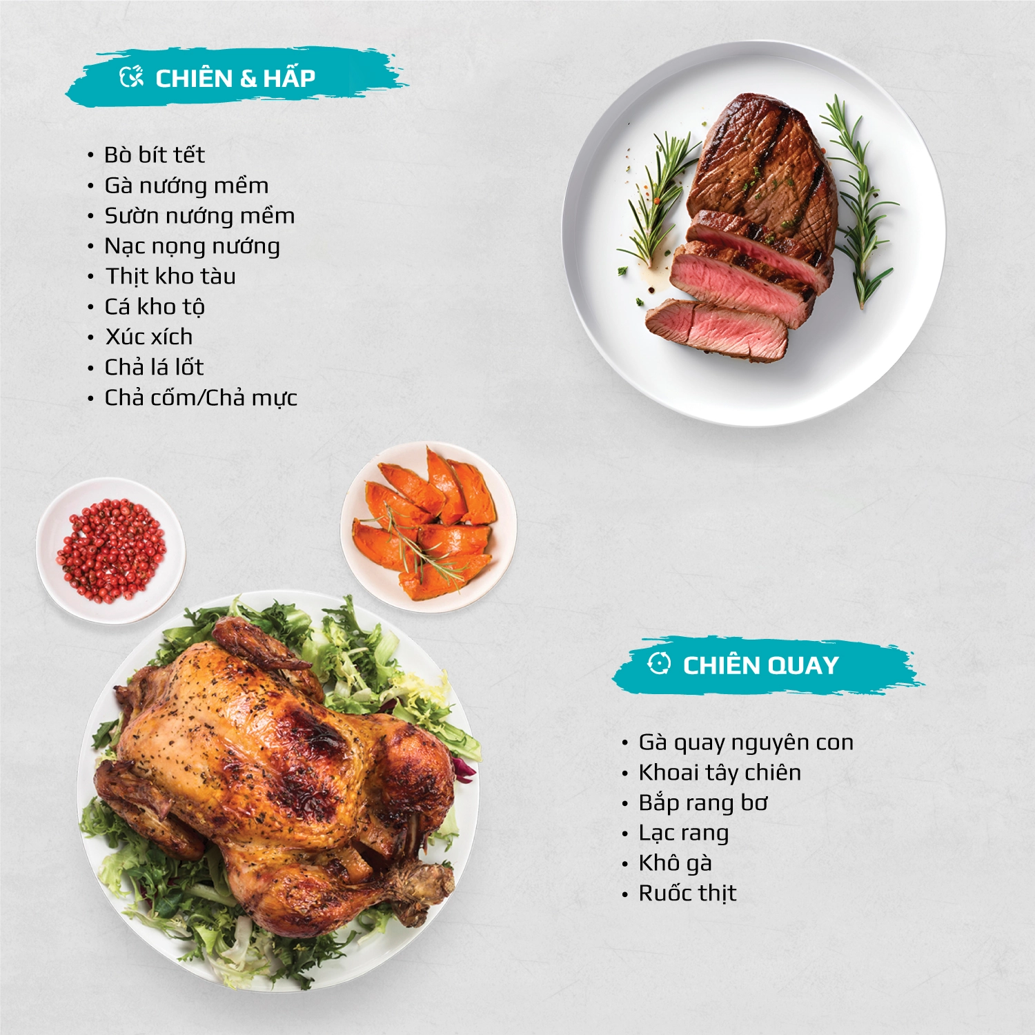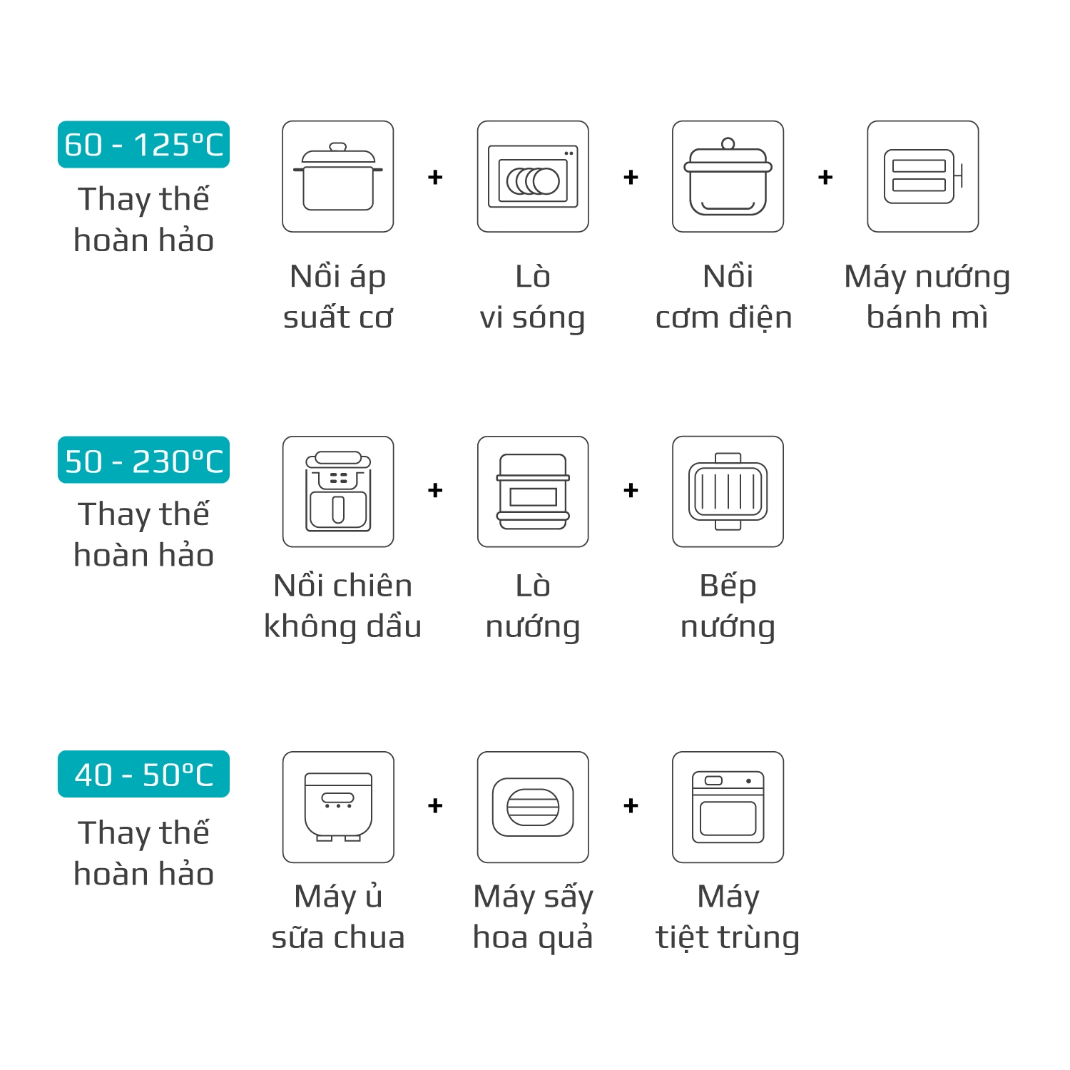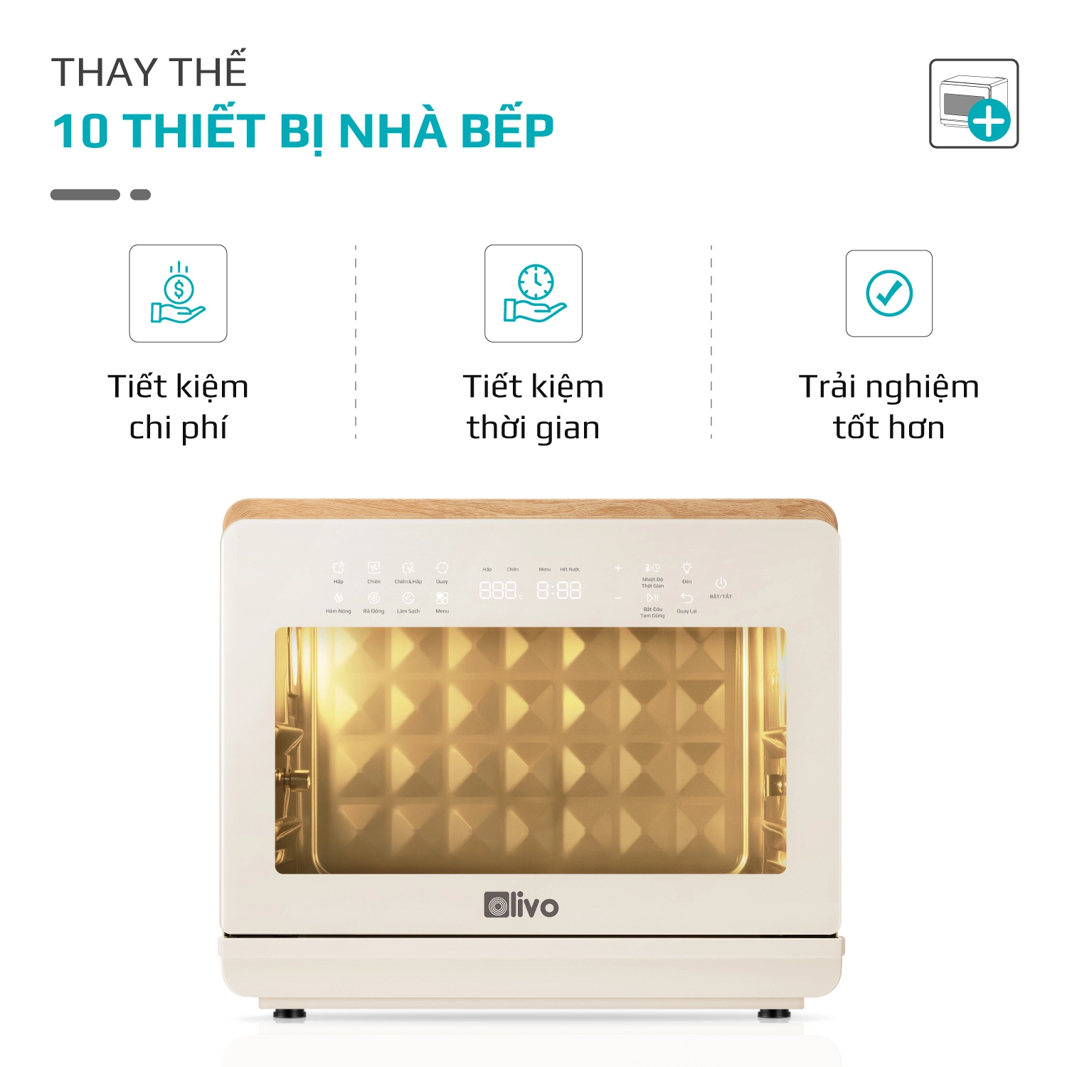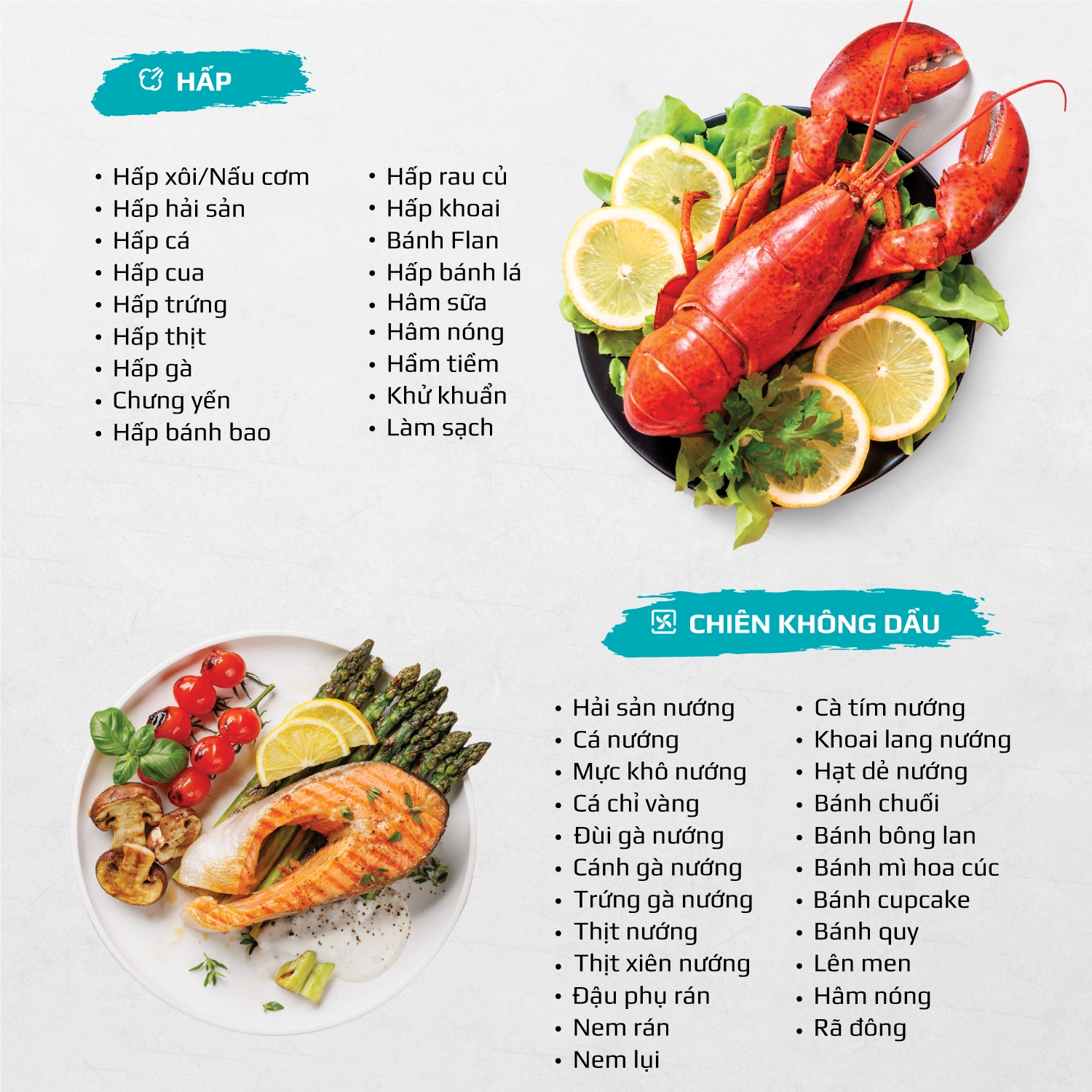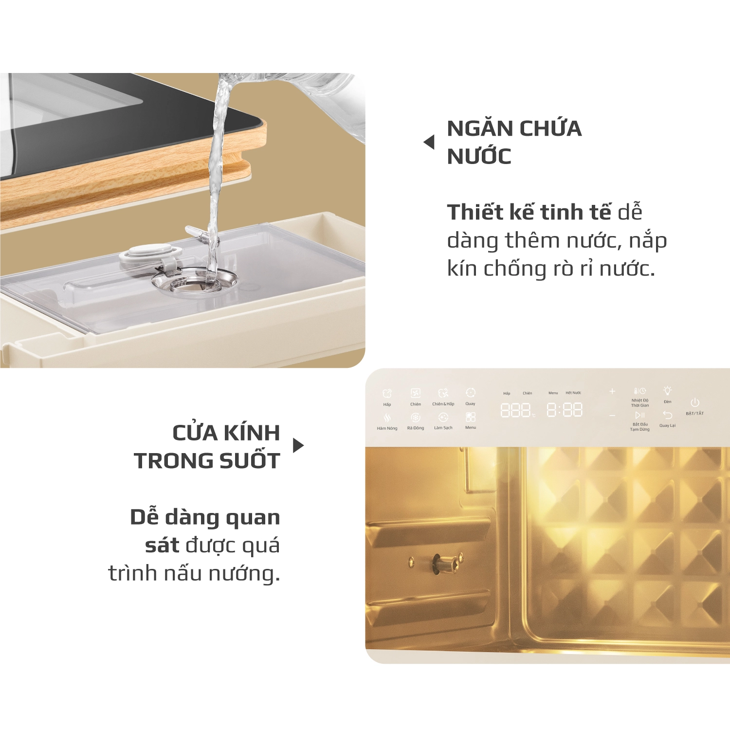 Chiên không dầu chiên đồ ăn vàng giòn mà không cần dùng đến dầu mỡ, giảm đến 95% lượng dầu mỡ dư thừa trong bữa ăn hàng ngày. Trong khi đó, hấp đồ ăn bằng hơi nước siêu nhiệt giúp giảm thời gian hấp, đồng thời bảo toàn tối đa dinh dưỡng có trong thực phẩm.