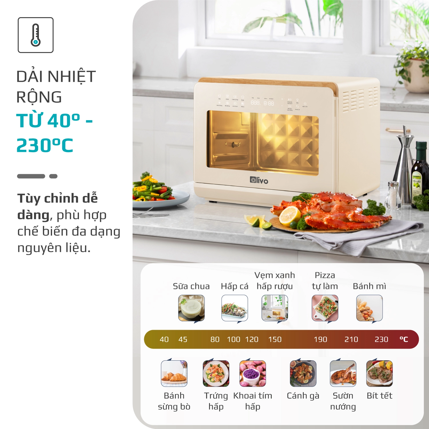 Nồi chiên hơi nước OLIVO SF20 pro có dải nhiệt từ 40-230 độ C, đây được coi là dải nhiệt rộng ấn tượng ở một chiếc nồi chiên. Với dải nhiệt rộng vượt trội, bạn có thể dùng nồi để chế biến nhiều món hơn như ủ sữa chua, sấy hoa quả đến quay gà, tôm, cá…