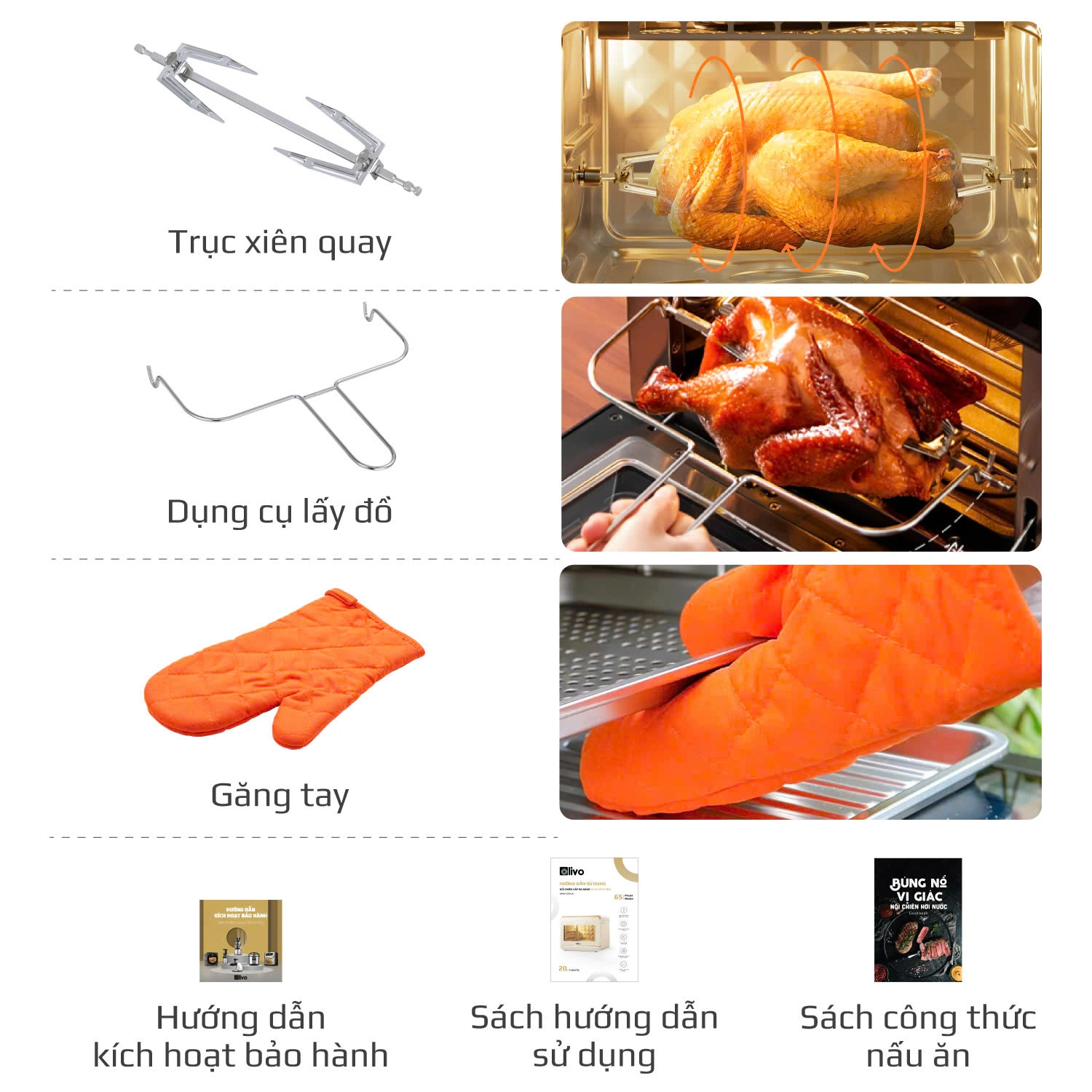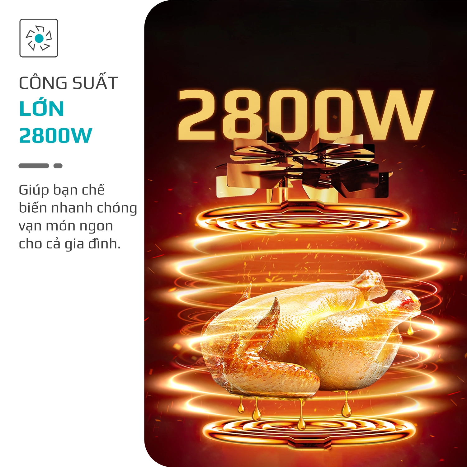 Quay gà nguyên con: Dễ dàng quay cả con gà lớn, đáp ứng nhu cầu của những bữa tiệc gia đình.