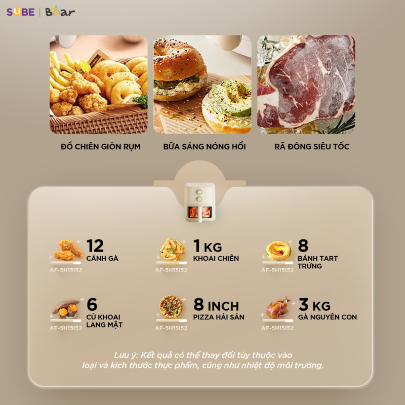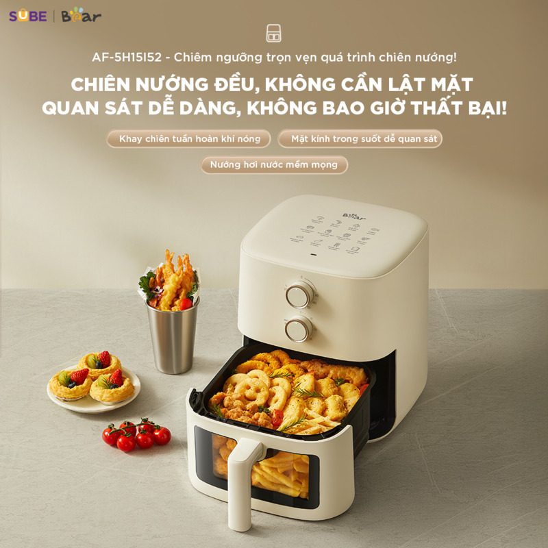 “Thử tưởng tượng xem: Một bữa tối với đùi gà vàng ruộm, giòn rụm mà không cần ngập dầu, căn bếp thơm phức mùi thức ăn thay vì khét lẹt mùi khói. Bạn có tin chỉ cần 1 chiếc nồi chiên không dầu Bear 5L AF-5H15I52 là đủ để biến điều đó thành sự thật? Với dung tích 5L siêu rộng, công nghệ luân chuyển khí nóng 360°, bạn tha hồ chiên/nướng đủ món cho cả nhà mà chẳng lo ngán ngẩm vì dầu mỡ. Từ khoai tây giòn tan đến cá hồi áp chảo đều thơm ngon chuẩn vị, mà không tốn quá 5 phút chuẩn bị!