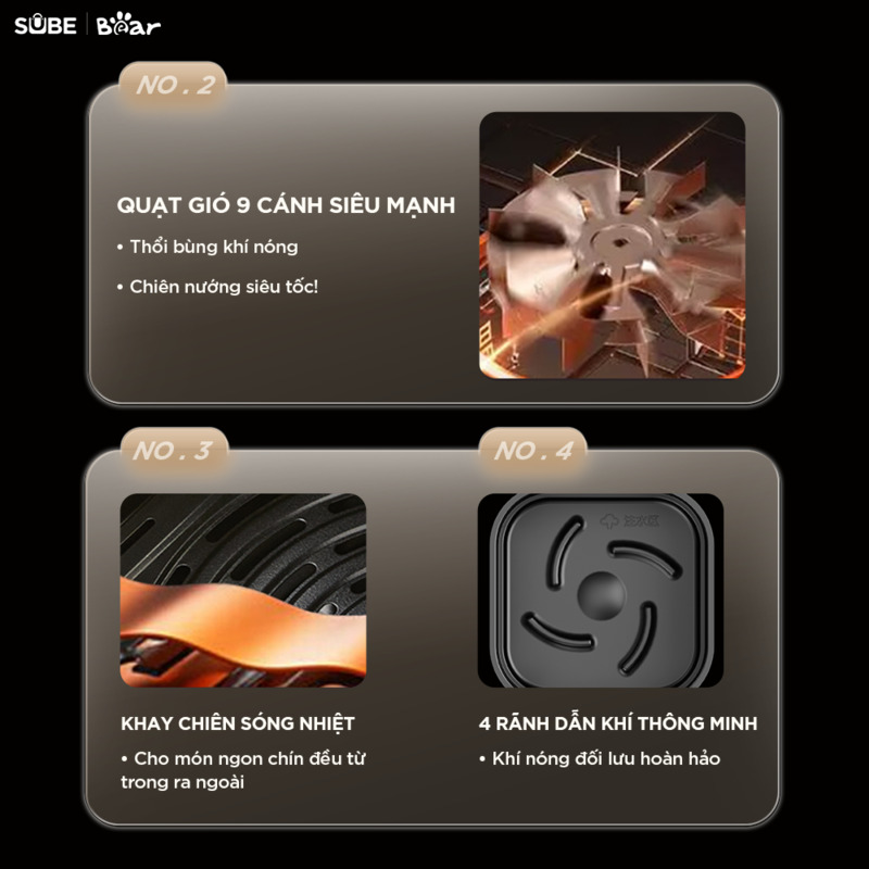 • Khay chiên thiết kế tối ưu: khay chiên lơ lửng tạo một khoảng trống với đáy nồi, cho phép luồng khí nóng lưu thông dễ dàng.”Hệ thống khí nóng xoáy 360° sử dụng công nghệ đối lưu nhiệt tiên tiến, trong đó một quạt 9 cánh hiệu suất cao (với tốc độ 2500 vòng/phút) tạo ra luồng khí nóng mạnh mẽ. Luồng khí này bao phủ toàn bộ bề mặt thực phẩm, đảm bảo nhiệt độ phân bố đồng đều giúp món ăn được nấu chín hoàn hảo từ lõi đến lớp vỏ ngoài, đạt được độ giòn rụm và màu vàng óng ả mà không cần thao tác lật trở thủ công.