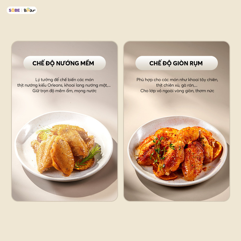 | Nêm nếm | Điều chỉnh độ mềm (biểu tượng “Mềm”) hoặc độ giòn/vàng (biểu tượng “Giòn”) cho món ăn, tùy theo khẩu vị | Tùy chỉnh người dùng (điều chỉnh từ chế độ gốc) | Tùy chỉnh người dùng (điều chỉnh từ chế độ gốc) |