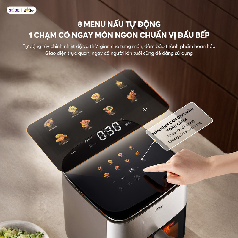 - Dễ sử dụng: bảng điều khiển cảm ứng thông minh, nút chức năng cảm ứng nhạy, hiển thị rõ ràng bằng biểu tượng và chữ. Nhiệt độ điều chỉnh từ 60-200 độ C, thời gian từ 1-60 phút phù hợp với nhiều món ăn.