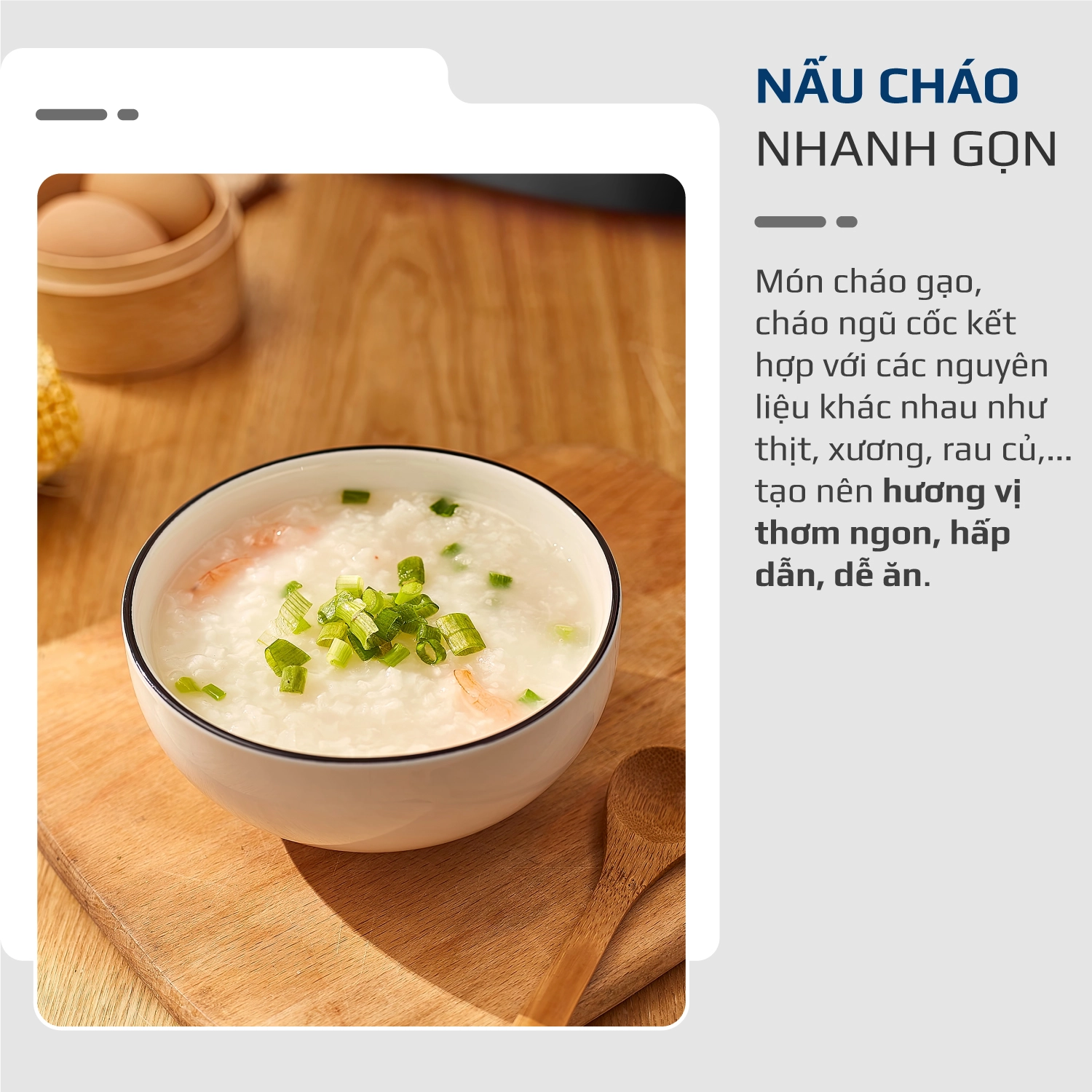 - Nấu cháo ngon, tiện lợi, bổ dưỡng cho cả nhà ngay trên chiếc nồi cơm điện với chức năng cháo cài đặt sẵn. Bạn có thể nấu món cháo gạo, cháo ngũ cốc kết hợp với các nguyên liệu khác nhau như xương, thịt, rau củ,… tạo nên hương vị thơm ngon, dễ ăn.