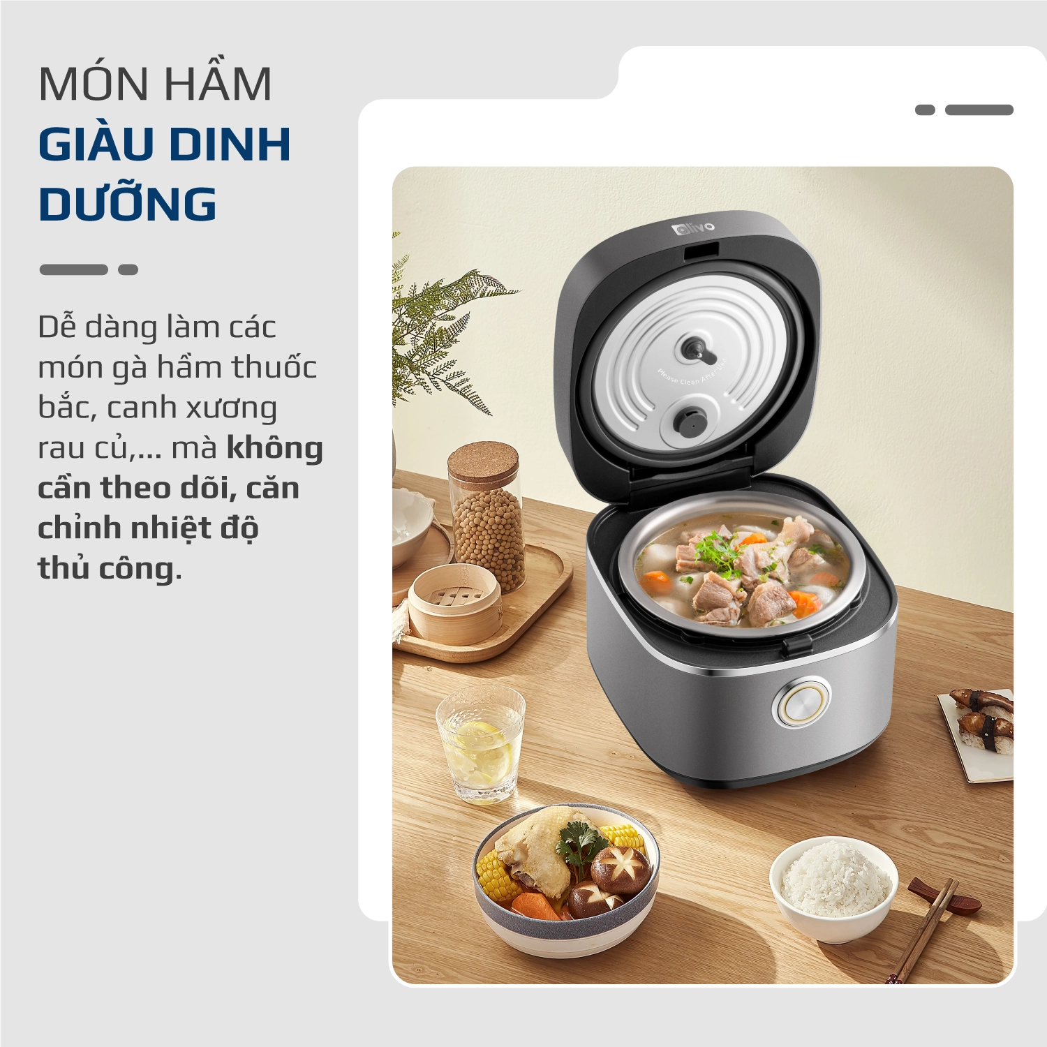 - Nấu món hầm giàu chất dinh dưỡng: dễ dàng làm các món như gà hầm thuốc bắc, canh xương rau củ,… mà không cần theo dõi, căn chỉnh nhiệt độ thủ công.