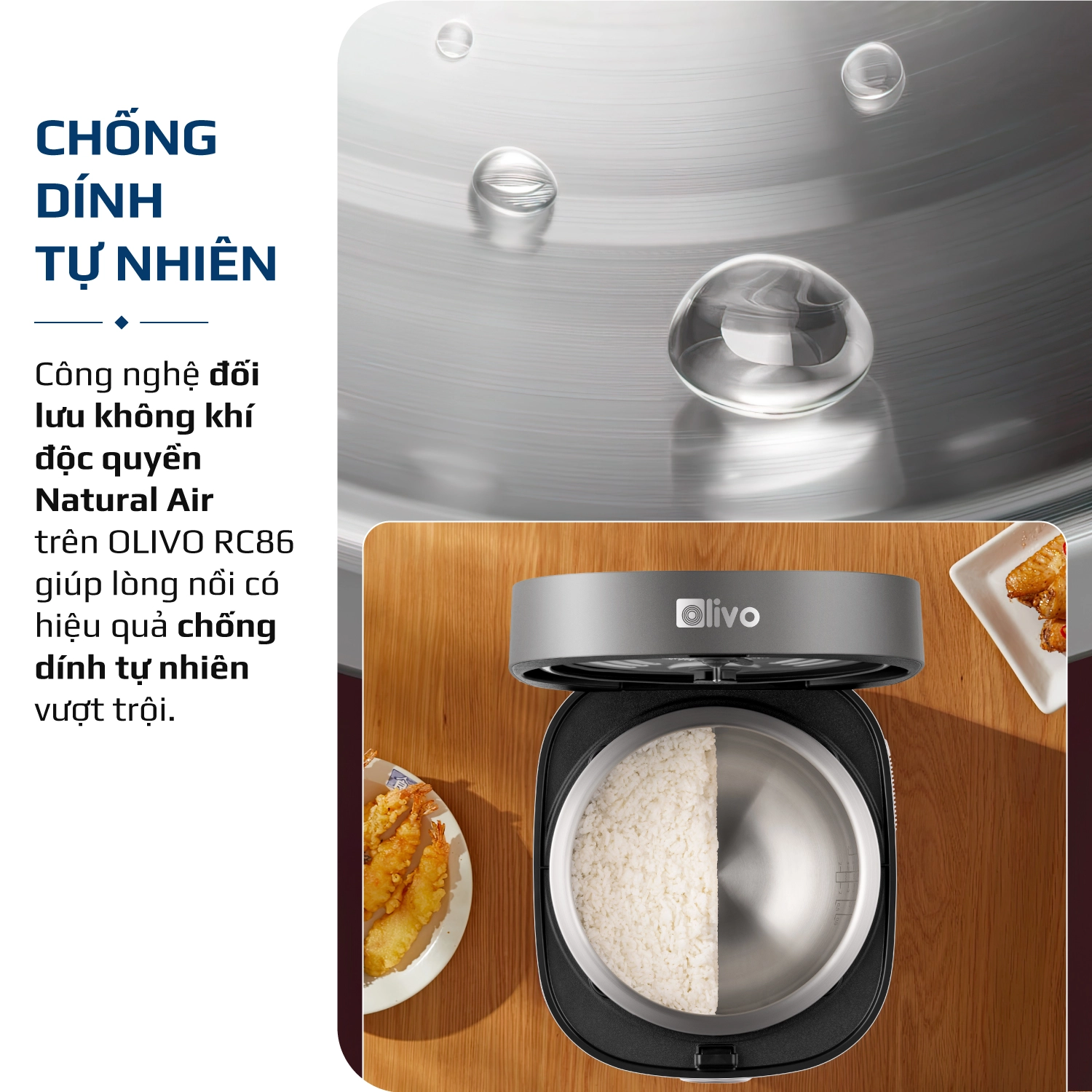 - Là công nghệ hiện đại nhất hiện nay trên nồi cơm điện với cơ chế hoạt động như sau: trong quá trình nấu công nghệ NATURAL AIR trên OLIVO RC86 tạo ra một lớp màng ngăn cách giữa hạt gạo và lòng nồi, có hiệu quả như một lớp chống dính tự nhiên, an toàn tuyệt đối với sức khỏe.