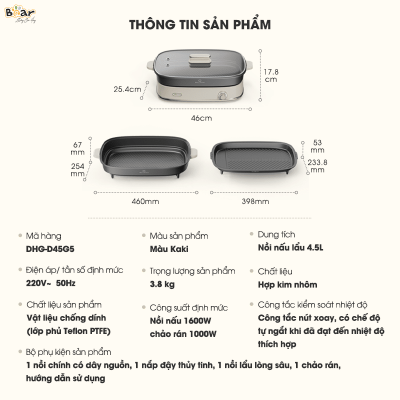 | Bộ phụ kiện sản phẩm | 1 nồi chính có dây nguồn – 1 nắp đậy thủy tinh – 1 nồi lẩu lòng sâu – 1 chảo rán – 1 sách HDSD. |