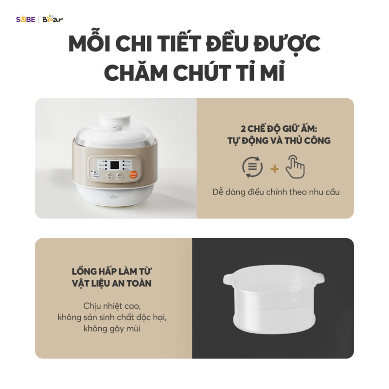 Khi bé bước vào giai đoạn ăn dặm, mẹ luôn băn khoăn làm sao để chuẩn bị những bữa ăn giàu dinh dưỡng, tươi ngon mỗi ngày mà vẫn có đủ thời gian chăm sóc bé và bản thân. Hãy để nồi nấu chậm Bear 0.8L DDZ-A08T8 giúp mẹ dễ dàng hơn trong việc nấu nướng nhờ vào tính năng tự động ưu việt và chất liệu an toàn tuyệt đối. Cùng tìm hiểu chi tiết về sản phẩm này trong bài viết dưới đây để biết cách nó hỗ trợ mẹ tốt hơn trong hành trình làm mẹ nhé!