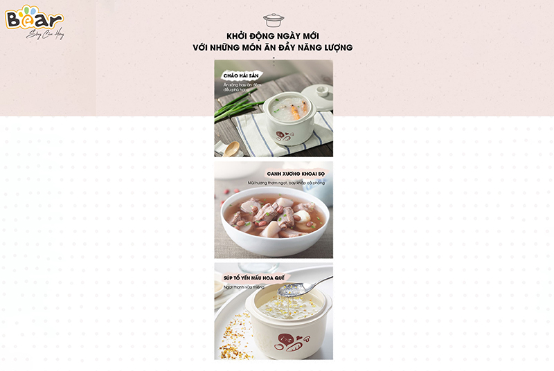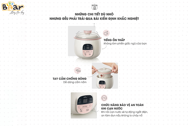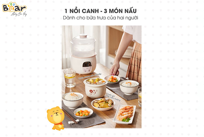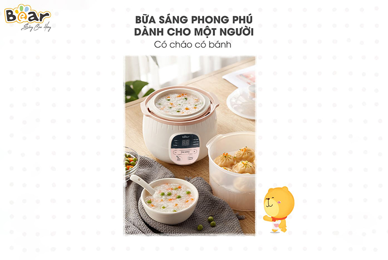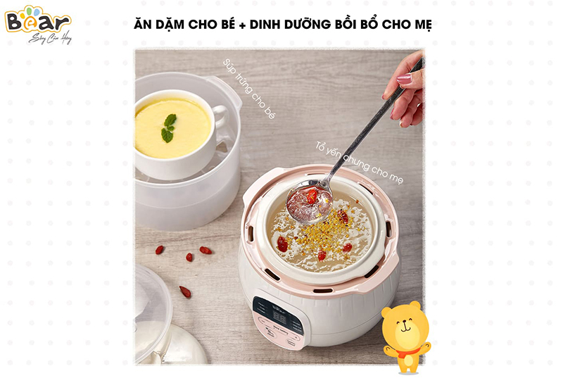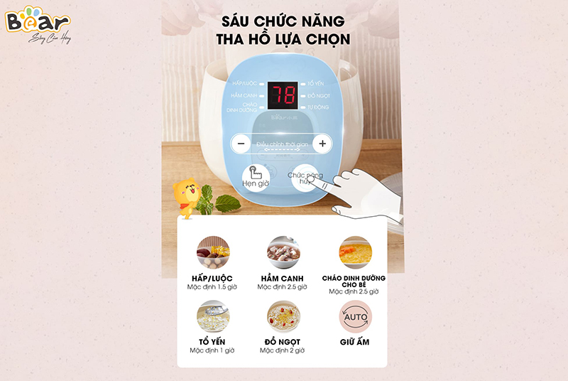 Không chỉ đảm nhiệt tốt việc nấu cháo, nồi nấu chậm Bear SUBE001 còn được trang bị tới 6 chức năng để bạn có thể chế biến nhiều món khác nhau như: hầm canh, nấu chè, hấp, luộc, chưng yến… Chính vì thế mà thiết bị này không chỉ phục vụ bữa ăn dặm cho bé mà còn phù hợp với người già, những đối tượng muốn tìm tới một giải pháp tiện lợi để bữa ăn hằng ngày thêm chất lượng.