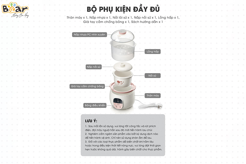 Thiết kế nhỏ gọn, thông minh và tiện lợi, nồi nấu chậm Bear SUBE001 mang tới cho người dùng thao tác sử dụng đơn giản với 3 bước như sau: