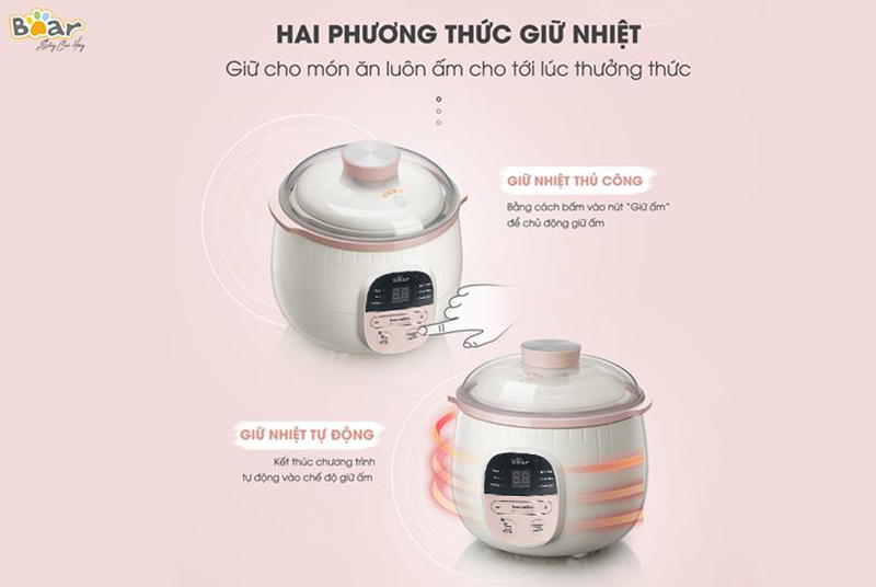 Sản phẩm được trang bị chức năng hẹn giờ nấu thông minh lên tới 9.5 giờ. Ngoài gia, nồi nấu chậm Bear SUBE001 còn có khả năng giữ nhiệt tốt, phù hợp với những người bận rộn, đặc biệt là phụ nữ sau sinh, các bạn sinh viên phải học tập làm việc cả ngày nên có ít thời gian chuẩn bị bữa ăn.