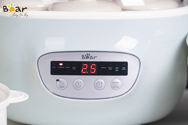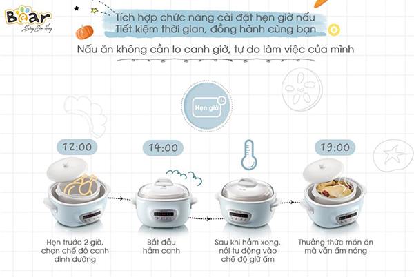Tiết kiệm thời gian nấu nướng cũng chính là ưu điểm nổi bật của sản phẩm này. Hơn thế, thiết bị còn có chức năng hẹn giờ nấu lên tới 9.5 giờ đồng hồ và giữ ấm sau khi thức ăn chín. Chính vì lý do đó mà bạn không cần quá lo lắng về việc phải dậy sớm để chuẩn bị đồ ăn cho bé yêu để kịp giờ đi làm. Tất cả đã có nồi nấu cháo chậm Bear SUBE003 lo. Việc mà người sử dụng cần làm chỉ là cài đặt thời gian nấu thức ăn và sẵn sàng thưởng thức bữa ăn vào ngày hôm sau.